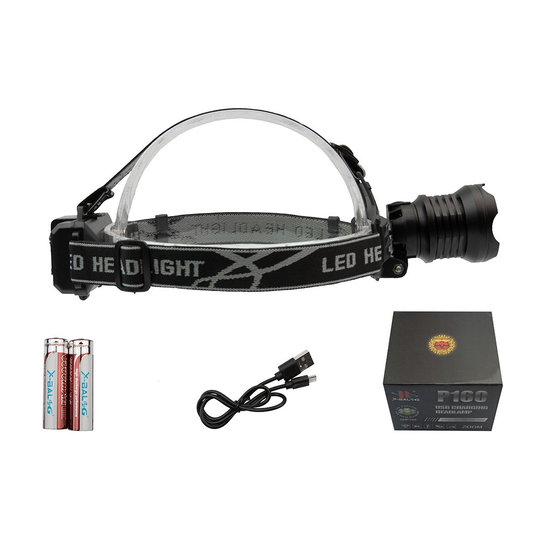 Zestaw zawiera: latarkę X-BALOG BL-8090-2-P160 LCZ-035, 2 x akumulator 18650, kabel USB oraz oryginalne pudełko.