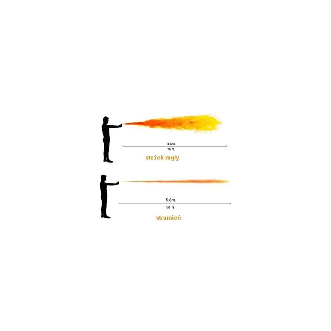 Gaz pieprzowy o pojemności 355 ml rozpylany jest w formie stożka mgły.