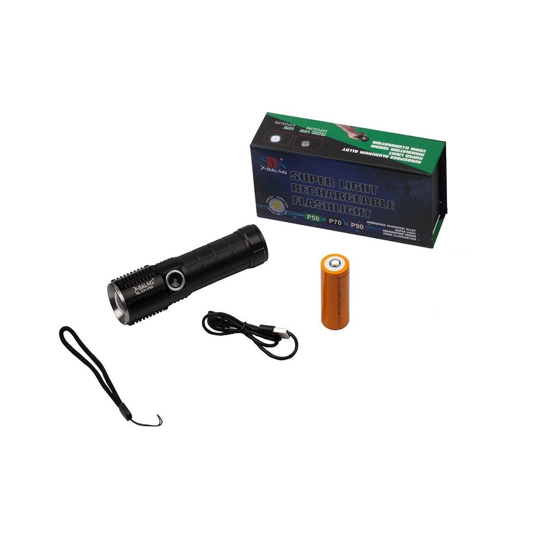 Zestaw zawiera: latarkę X-BALOG BL-X31-P90 L-091, akumulator litowo-jonowy 26650, kabel USB, smycz na rękę, pudełko.