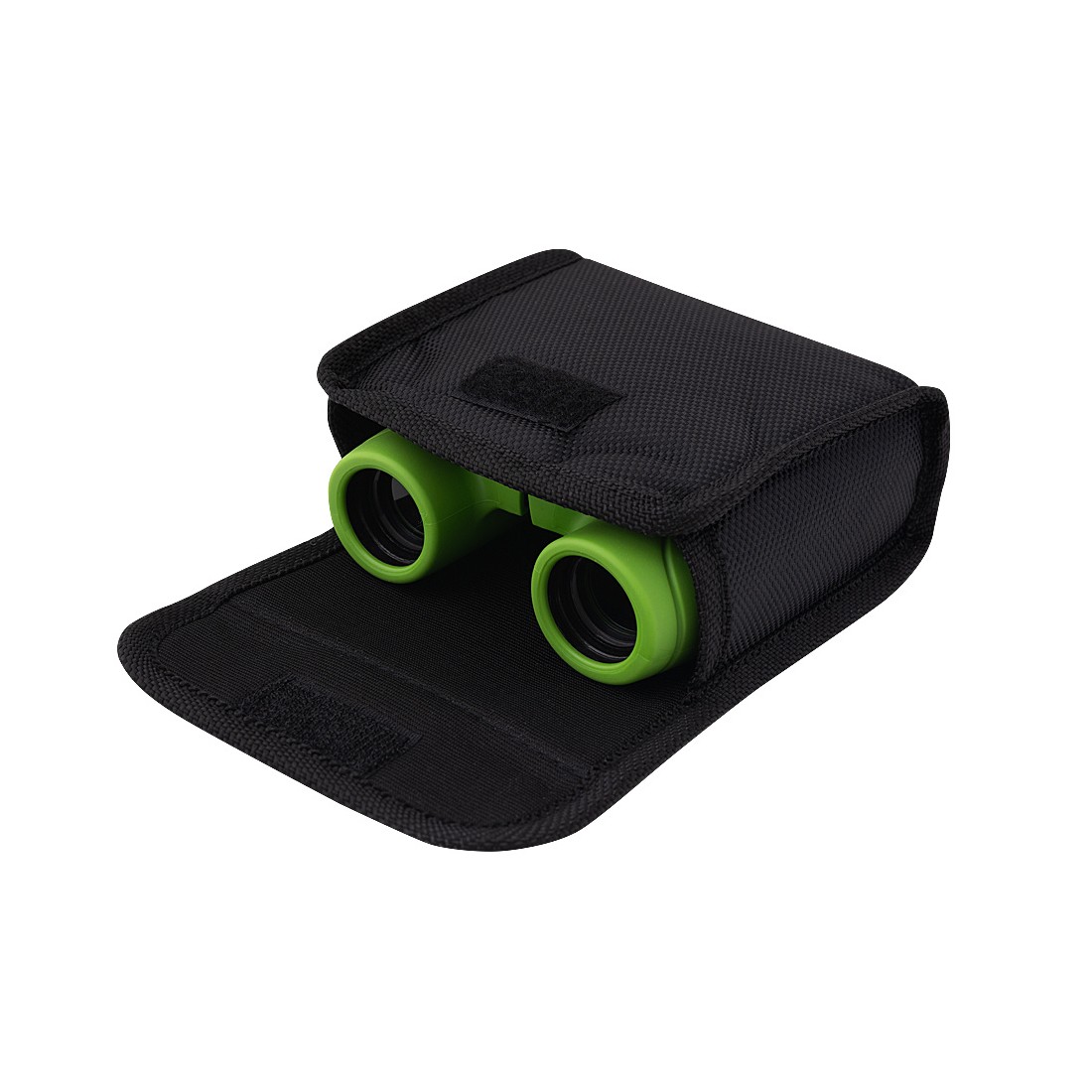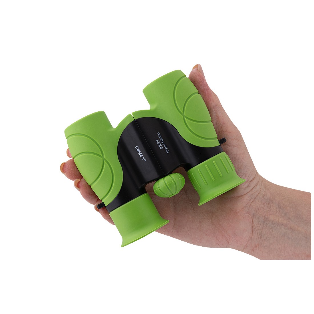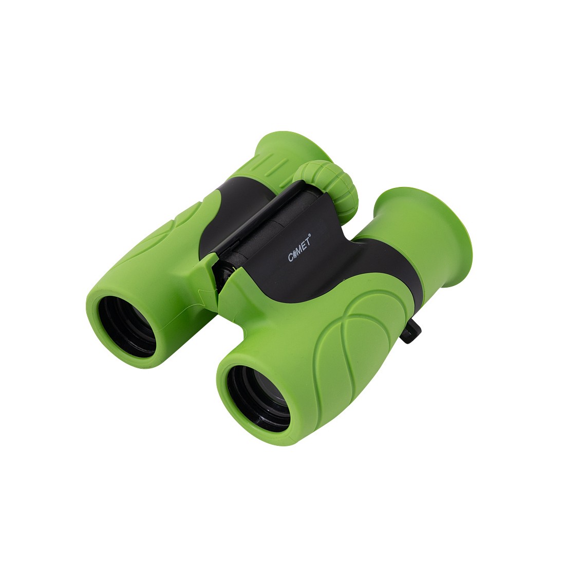 Solidnie wykonana lornetka dla dzieci o nowoczesnym, atrakcyjnym designie, pokryta ochronną warstwą gumy w intensywnie zielonym kolorze, która skutecznie zabezpiecza układ optyczny przed przypadkowymi uderzeniami i upadkami.