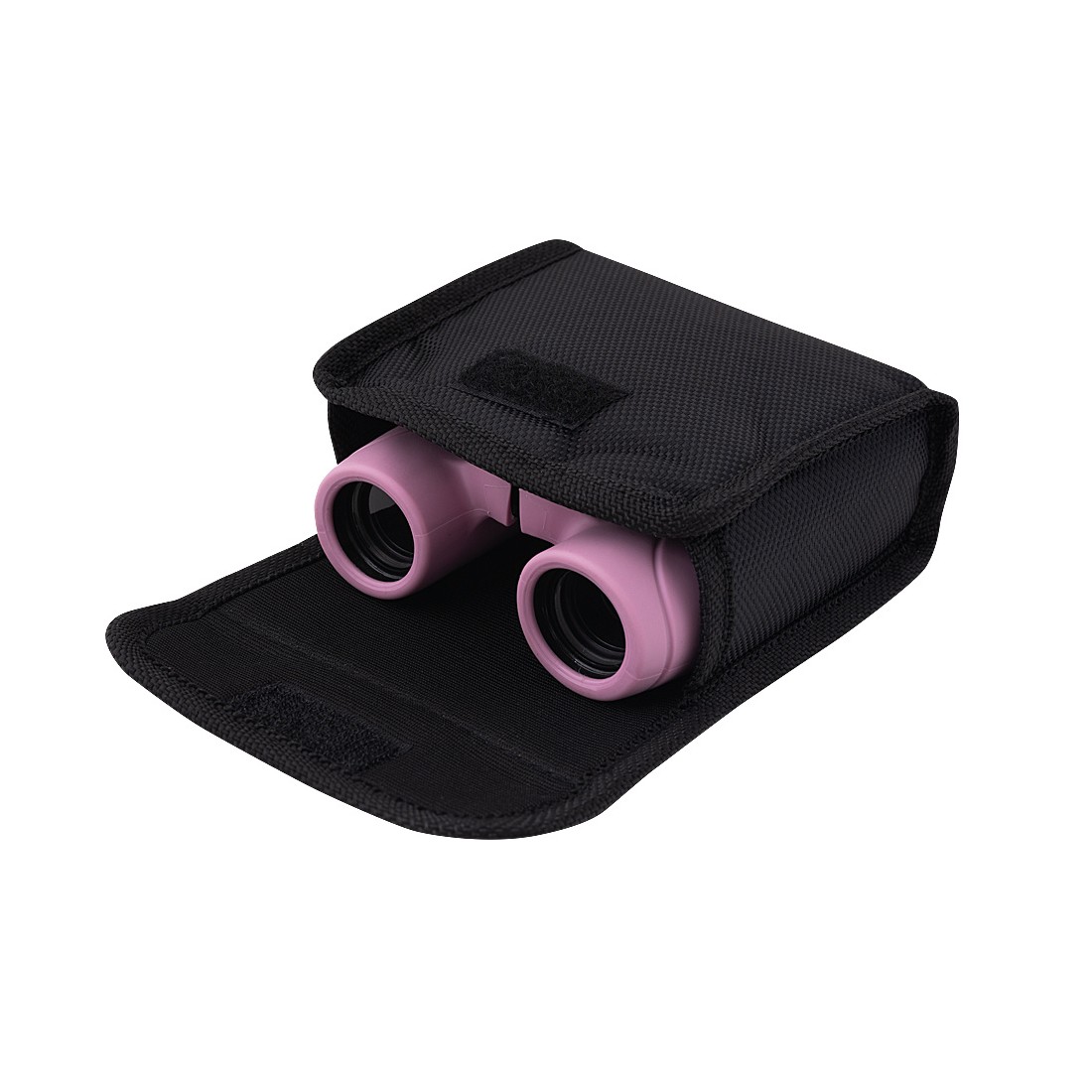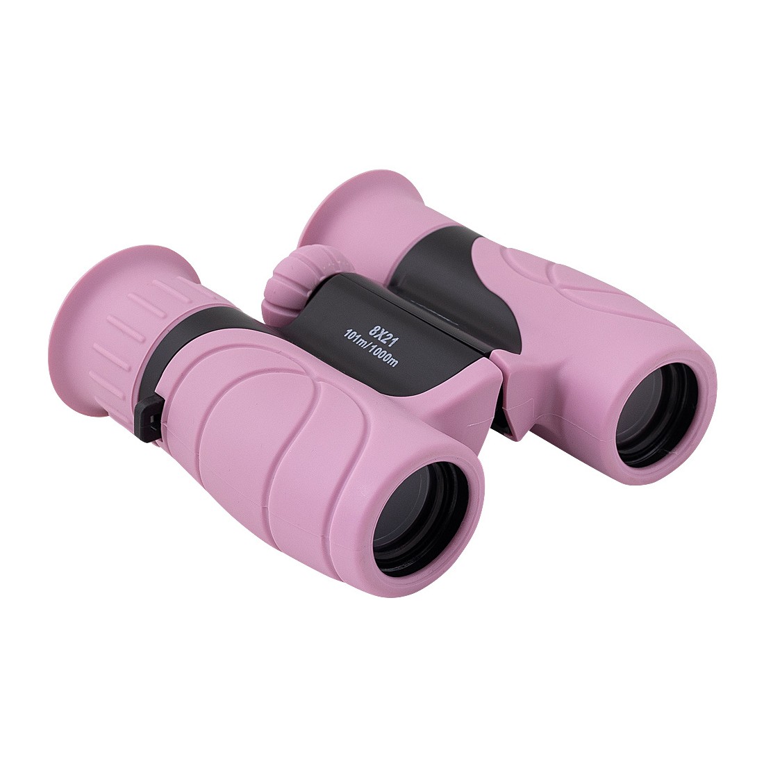 Wytrzymała i starannie wykonana lornetka dziecięca w nowoczesnym stylu, pokryta ochronną warstwą gumy w intensywnym różowym kolorze.