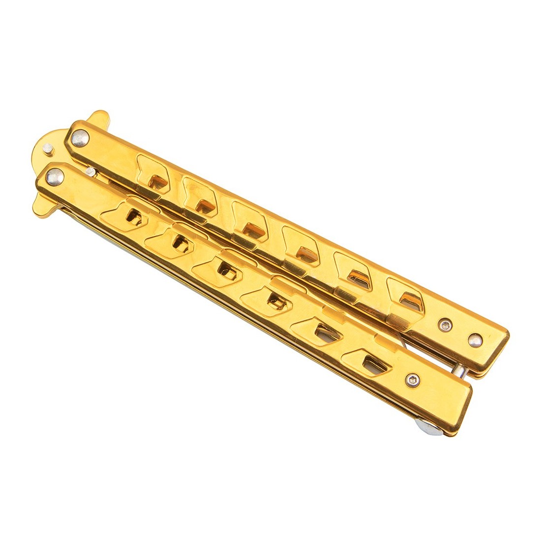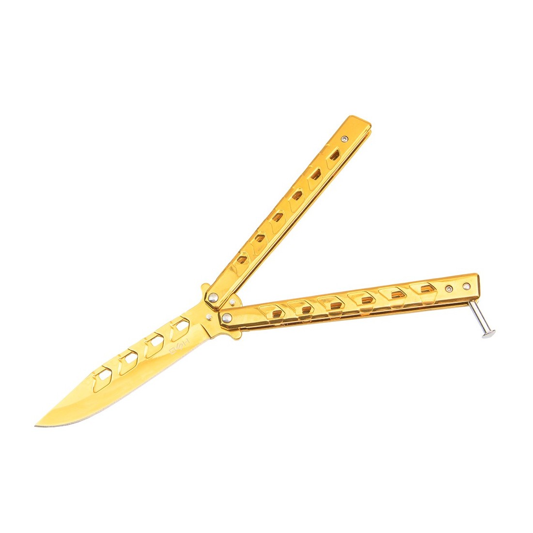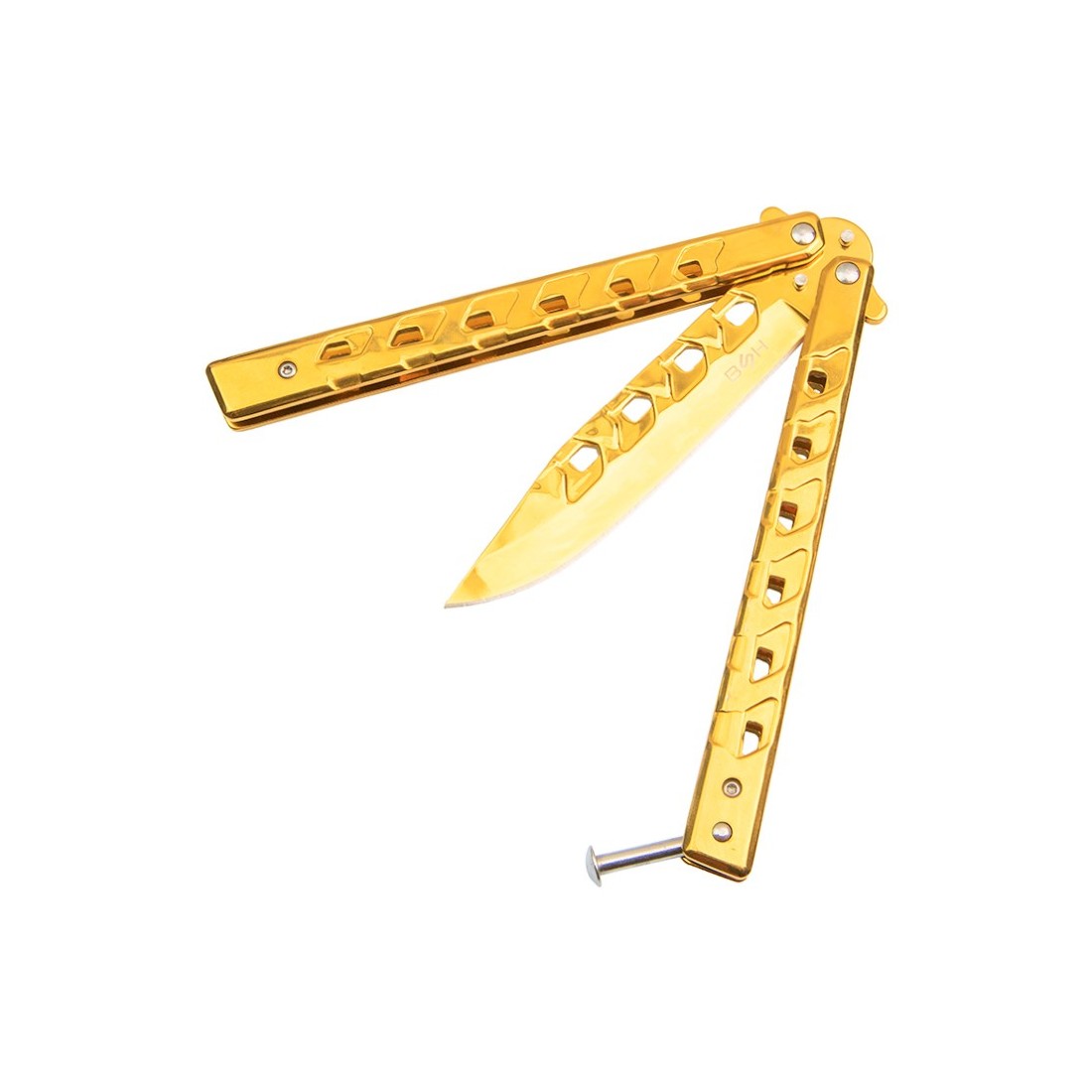 Nóż motylkowy w wypasionym, złotym kolorze to trafny wybór dla każdego fana!