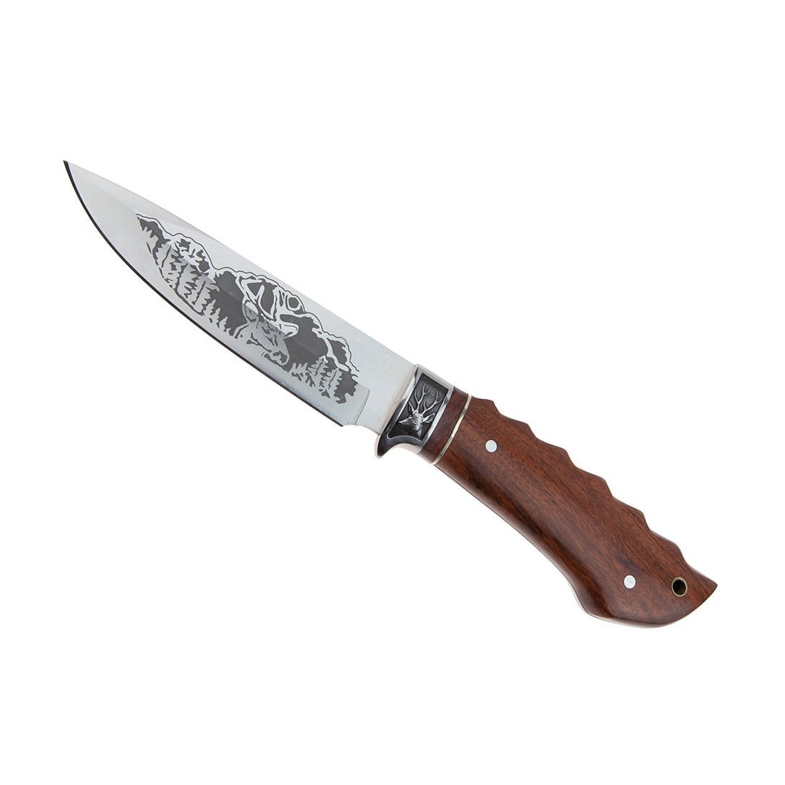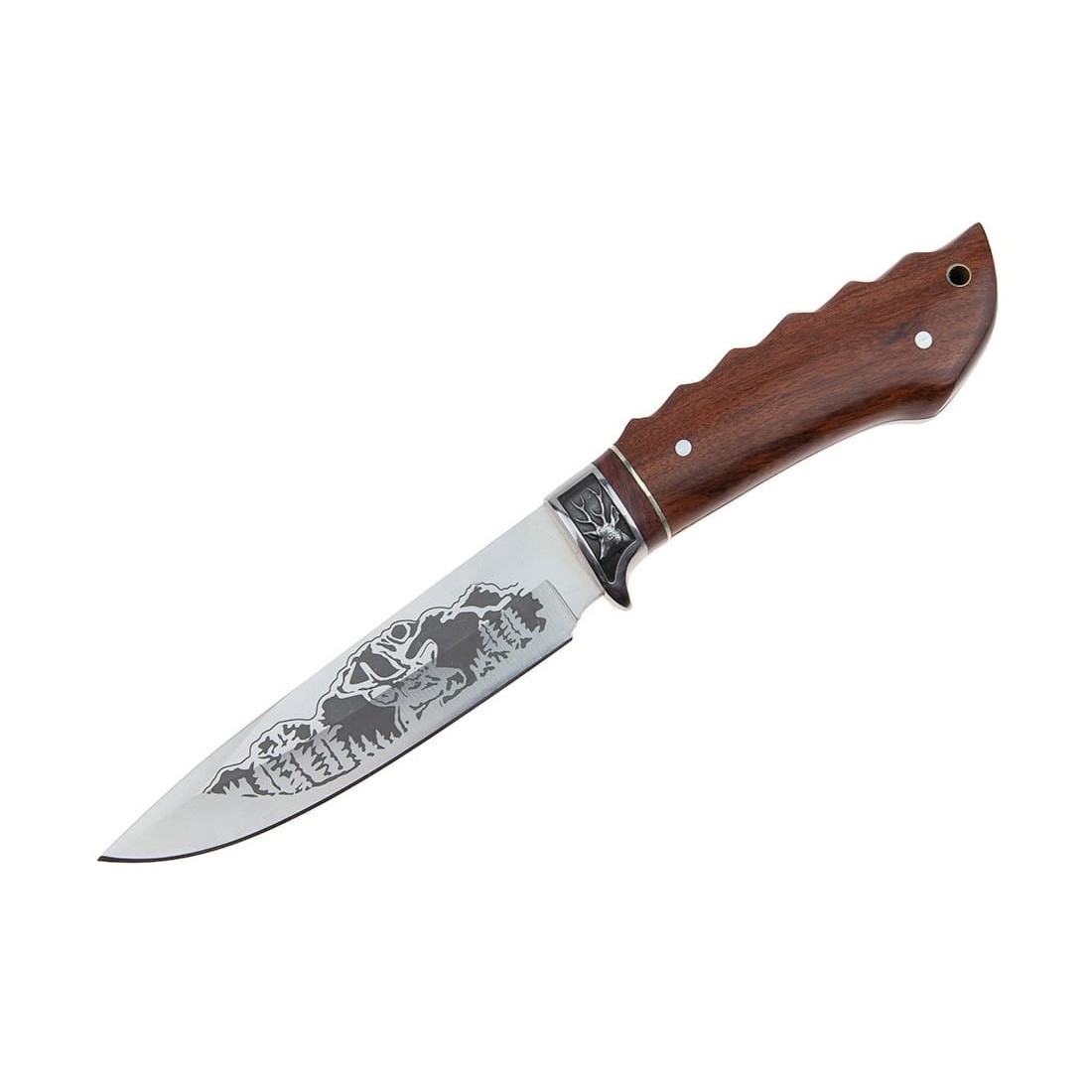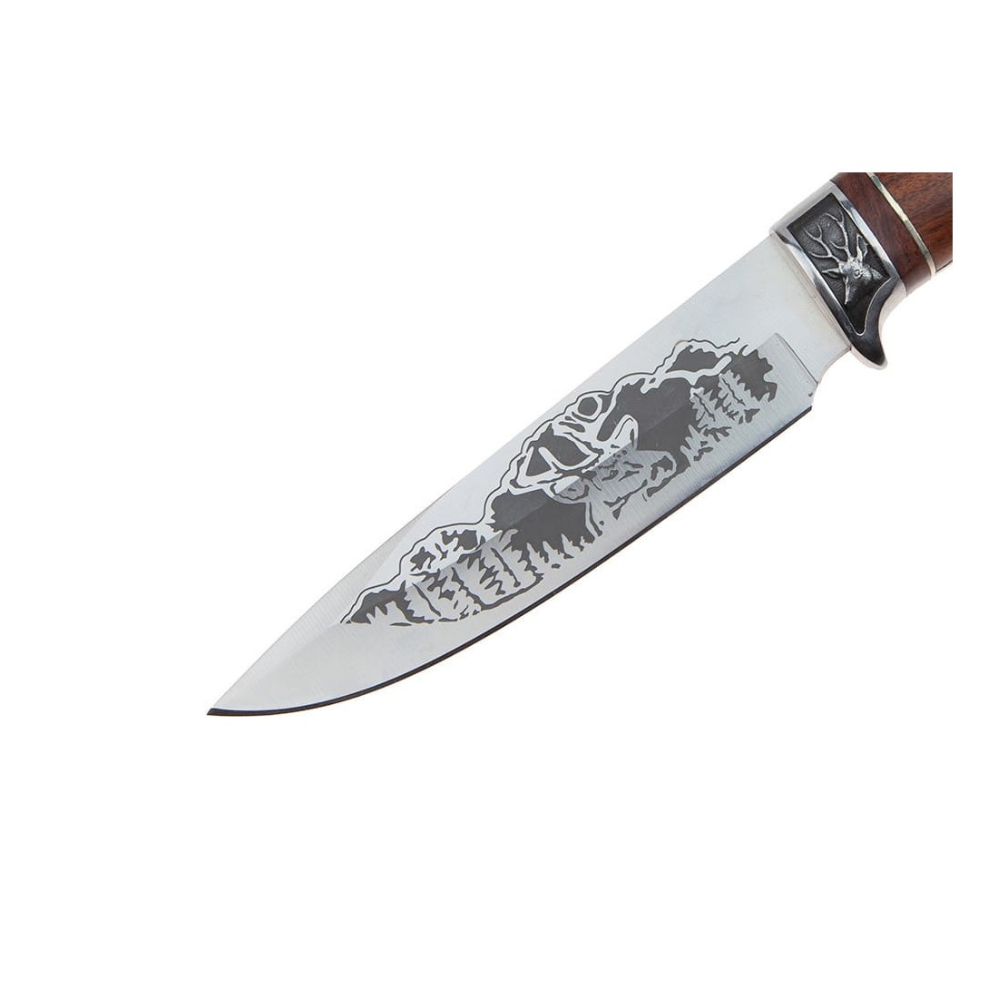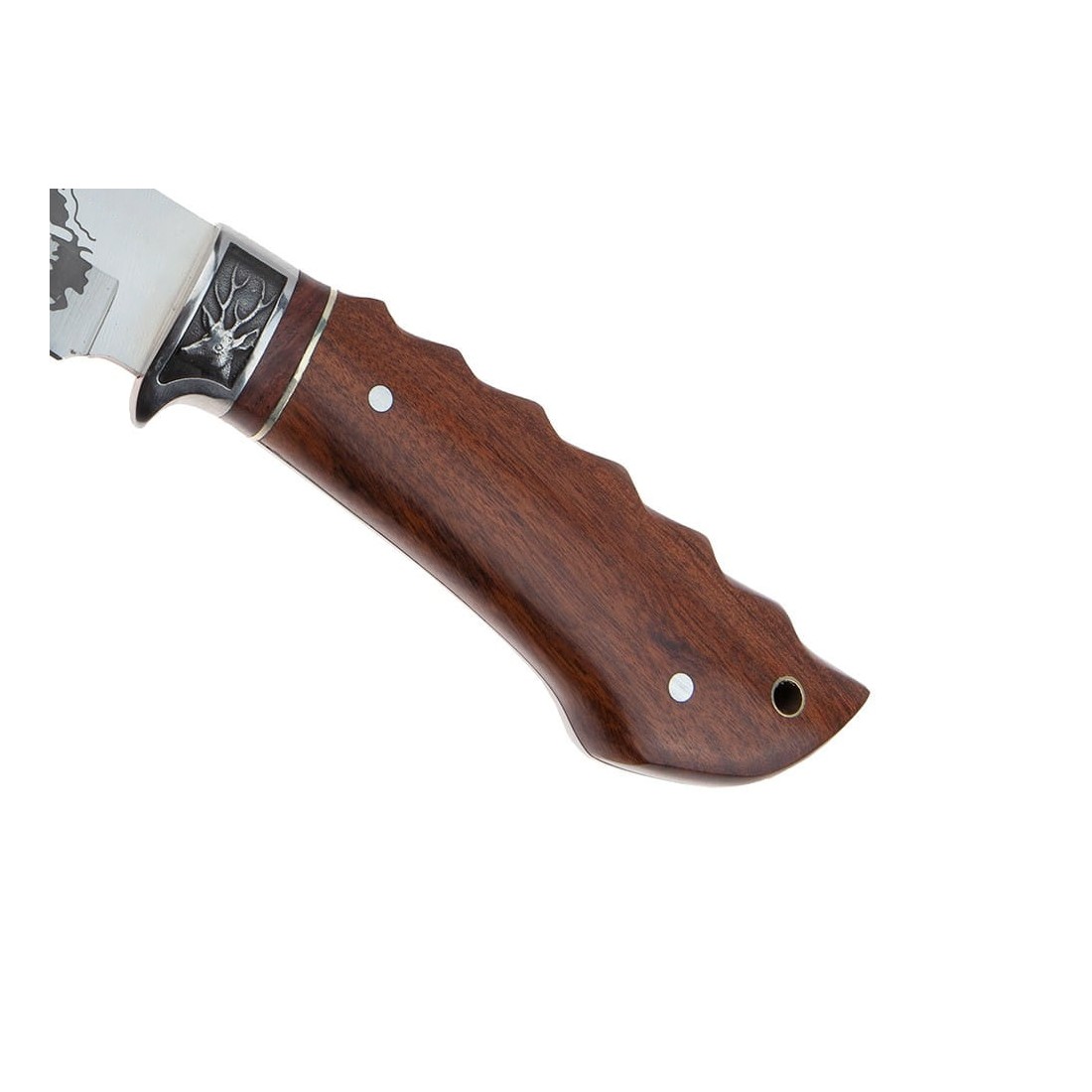 Metalowy jelec z dekorem w postaci głowy jelenia, zabezpiecza dłoń przed niepożądanym osunięciem się w stronę krawędzi tnącej.