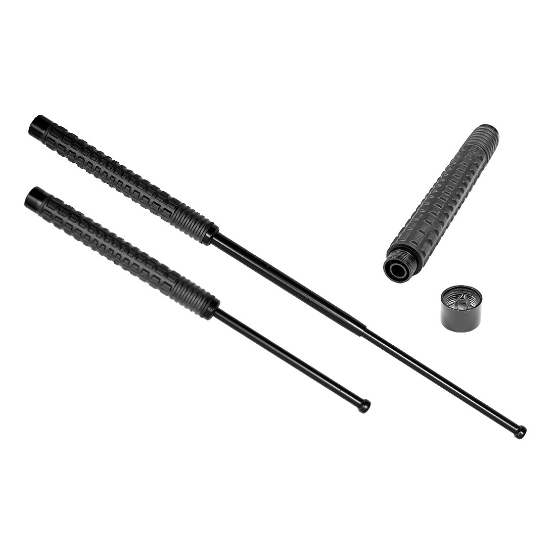 Elementy rozkładane pałki są pokryte czarnym chromem, co zapewnia wysoką odporność na otarcia wynikające ze składania oraz na uszkodzenia powstające podczas uderzeń. Rękojeść z antypoślizgowej, syntetycznej gumy z wypustkami gwarantuje pewny, wygodny chwyt i skutecznie zapobiega ślizganiu się dłoni, nawet podczas intensywnego użytkowania.