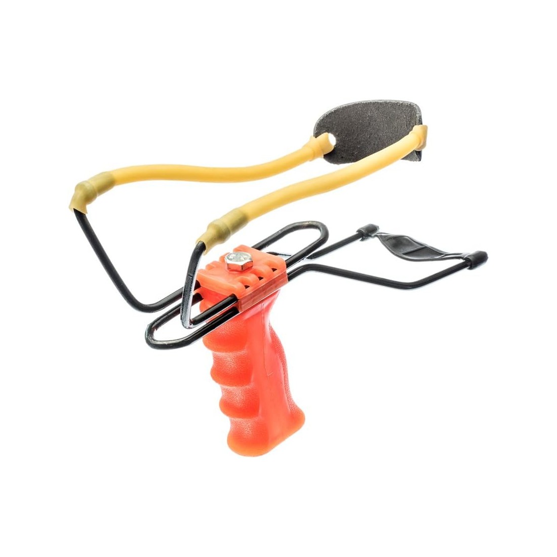 Skórzany koszyczek na końcu gumy pozwala na stabilne utrzymanie pocisku i zwiększa komfort przy każdym naciągu.