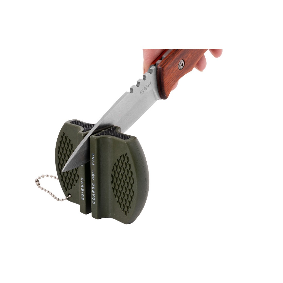 Ostrzałka marki BSH Adventure w kolorze army green to kompaktowe, dwustopniowe urządzenie, które idealnie sprawdzi się w ostrzeniu noży, tasaków, maczet oraz innych ostrzy o grubości nieprzekraczającej 5 mm.