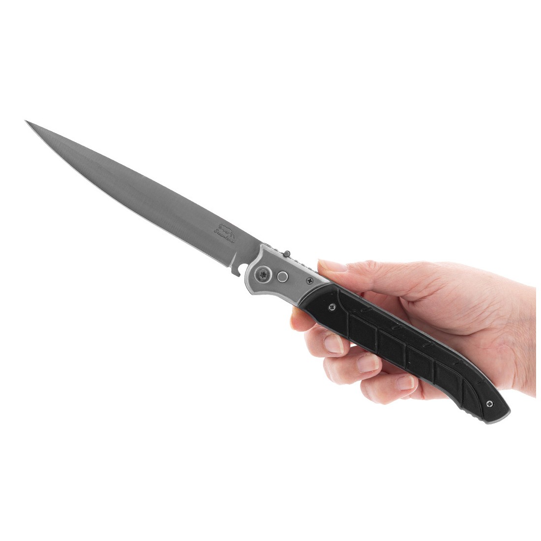 Jego głownia, o wydłużonym profilu clip point, została wykonana z wysokiej jakości stali nierdzewnej 420, odpornej na zużycie i korozję, co zapewnia jej długą żywotność nawet przy intensywnym użytkowaniu.