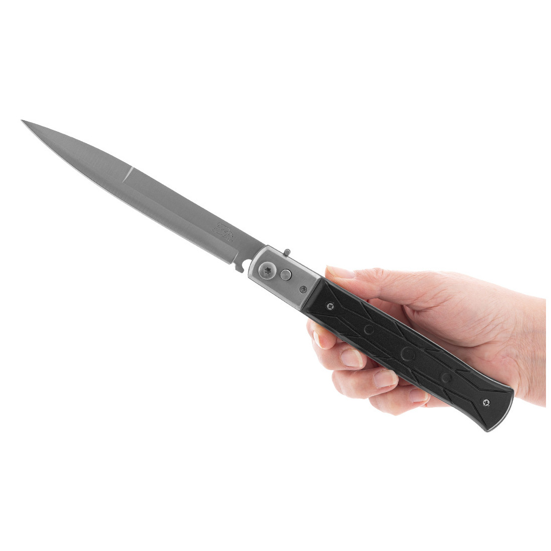 Mechanizm sprężynowy umożliwia błyskawiczne otwarcie ostrza za pomocą przycisku.
