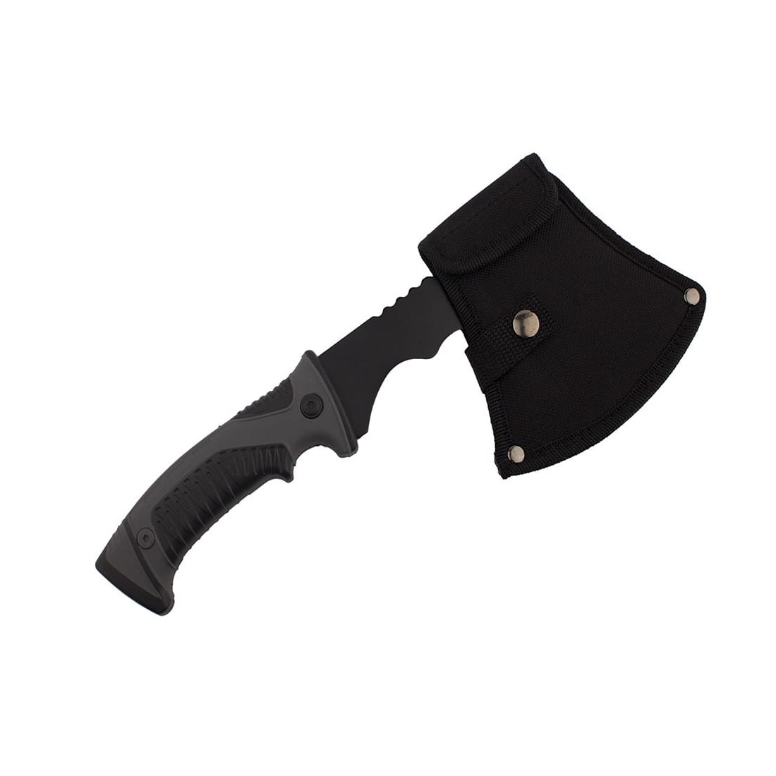 Toporek taktyczny posiada czarny pokrowiec na ostrze, który można przymocować do paska spodni.