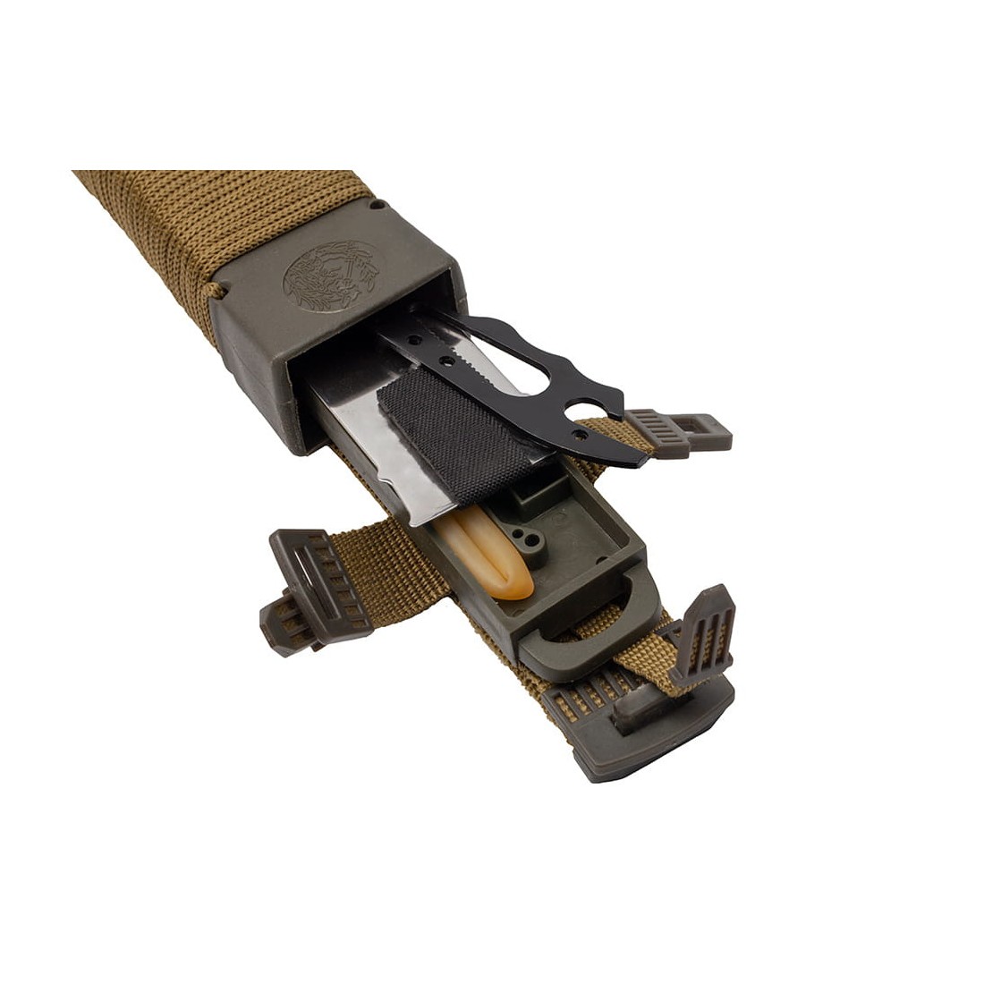 Fabrycznie umieszczono w nim mini zestaw survivalowy, w którego skład wchodzą: zapałki, draska, żyłka, haczyk i plaster.