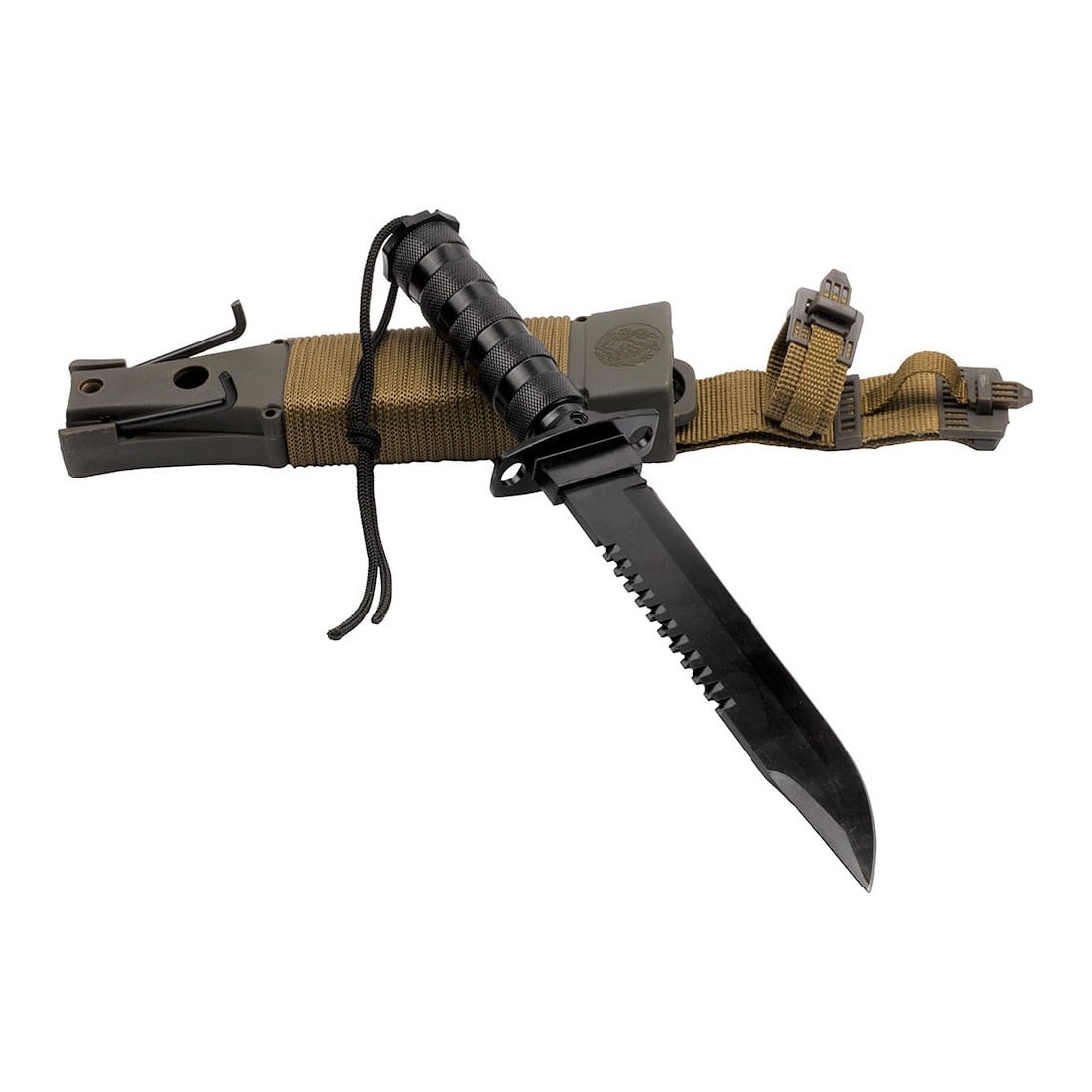 Nóż taktyczny Rambo posiada wielofunkcyjną pochwę z tworzywa, cordury i oplotu z linki.