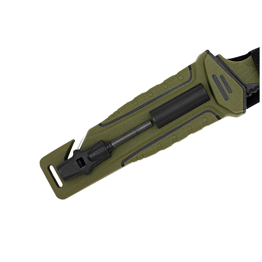 W zestawie znajduje się pokrowiec w wytrzymałym, gumowanym wykończeniu, z przecinakiem do pasów oraz krzesiwem z gwizdkiem - idealnym do rozpalenia ognia i wezwania pomocy.