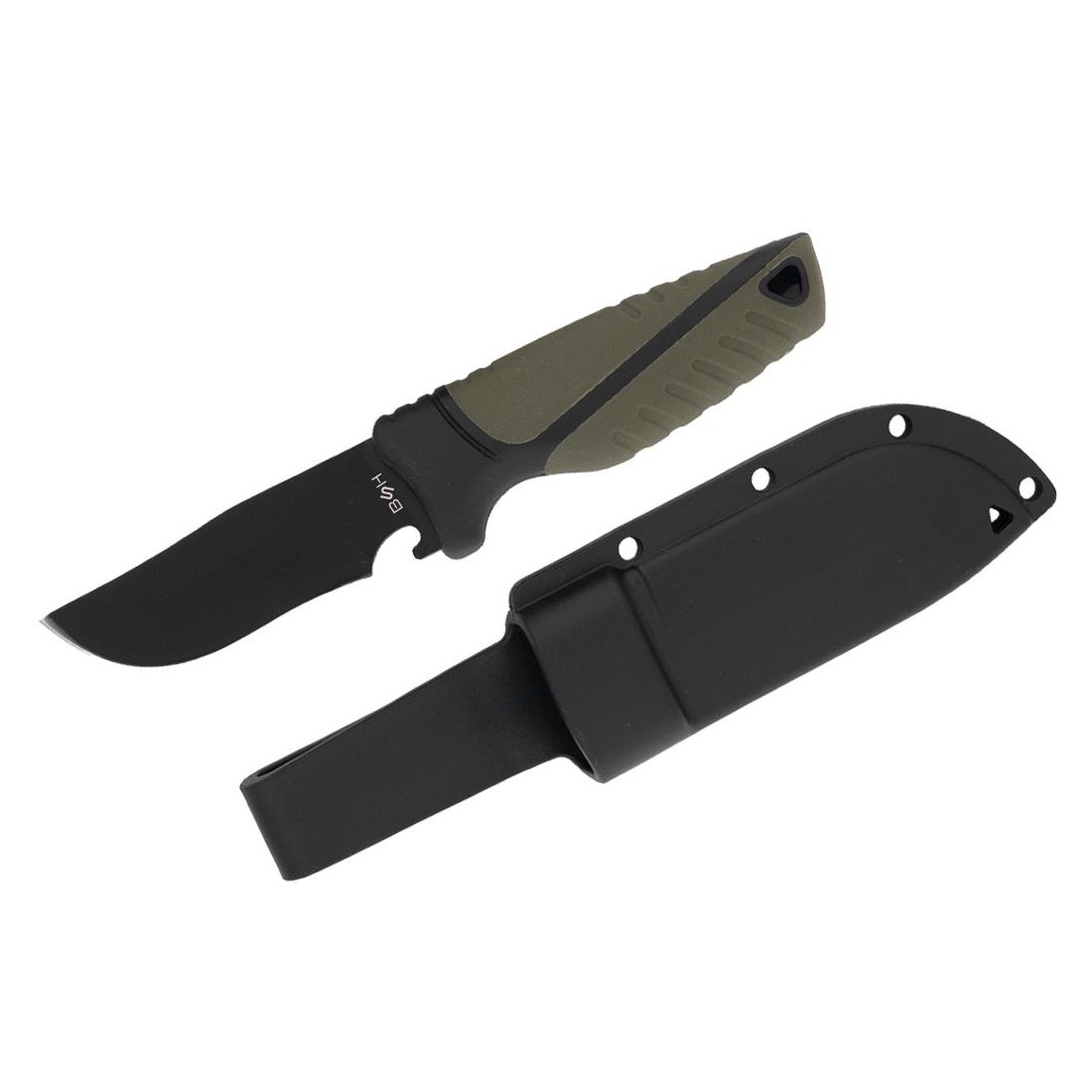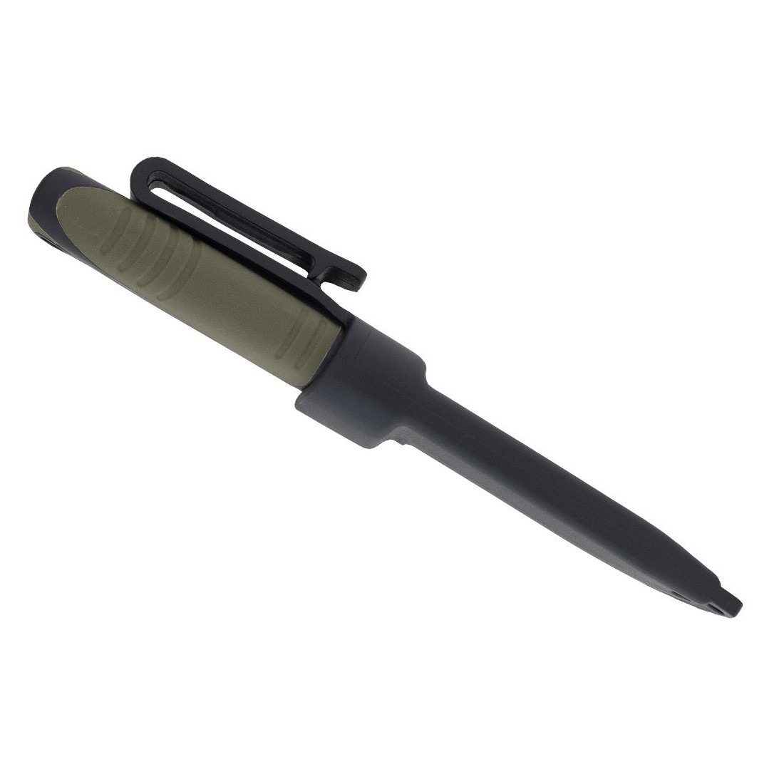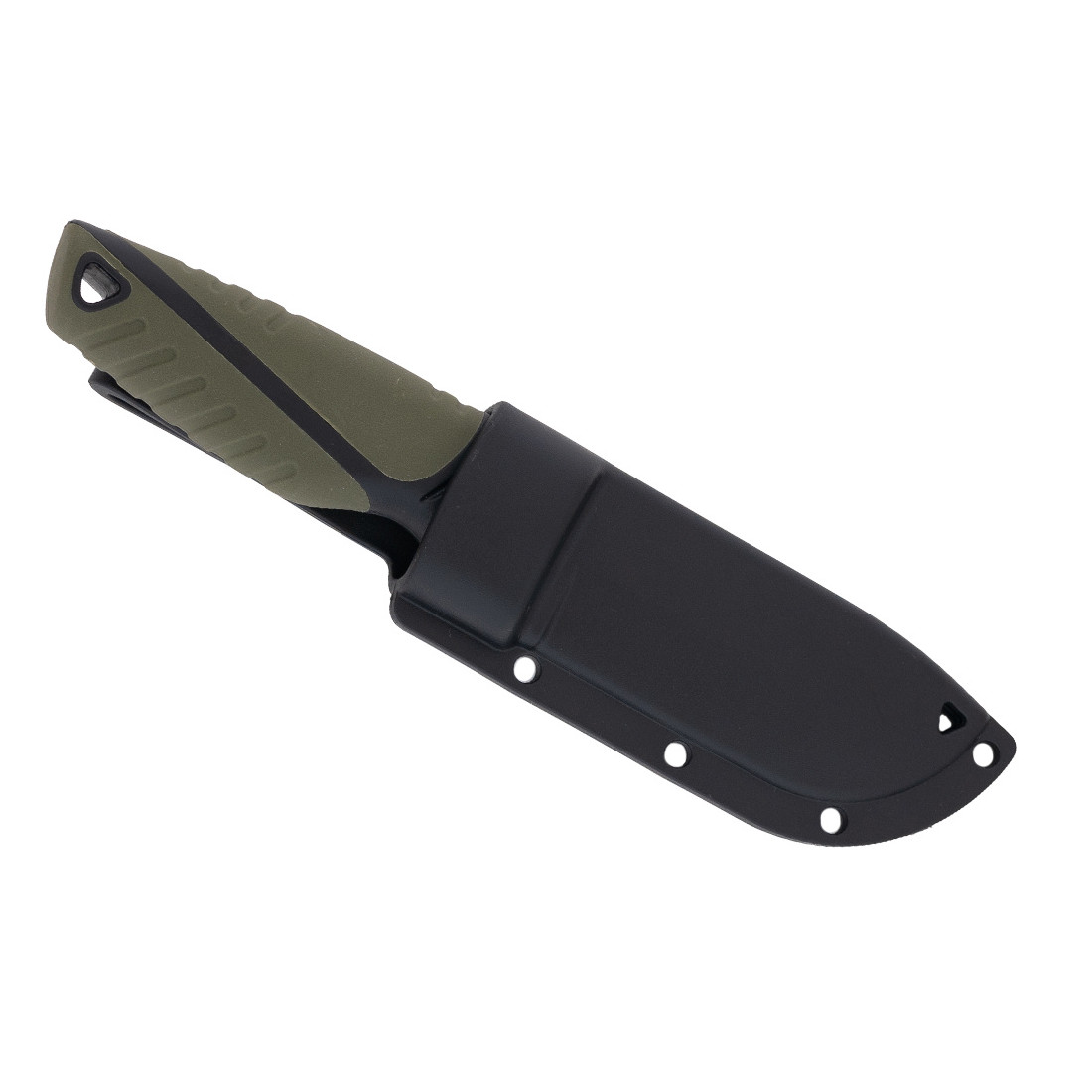 Nóż wyposażono w solidny pokrowiec z mocnego tworzywa, który można wygodnie przypiąć do paska.